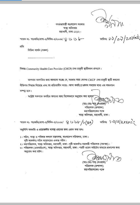 Community Health Care Provider (CHCP) দের চাকুরী স্থায়ীকরন প্রসংগে। আপনার অবগতির জন্য জানানো যাচ্ছে যে, সরকার সারা দেশের CHCP দের চাকুরী স্থায়ী করনের নীতিগত সিদ্ধান্ত নিয়েছে এবং তা প্রক্রিয়াধীন আছে। আশা করছি দ্রুততম সময়ের মধ্যে এর বাস্তবায়ন সম্পন্ন হবে। সংশ্লিষ্ট সকলকে অবহিত করনের জন্য বিশেষভাবে অনুরোধ করা হলো।